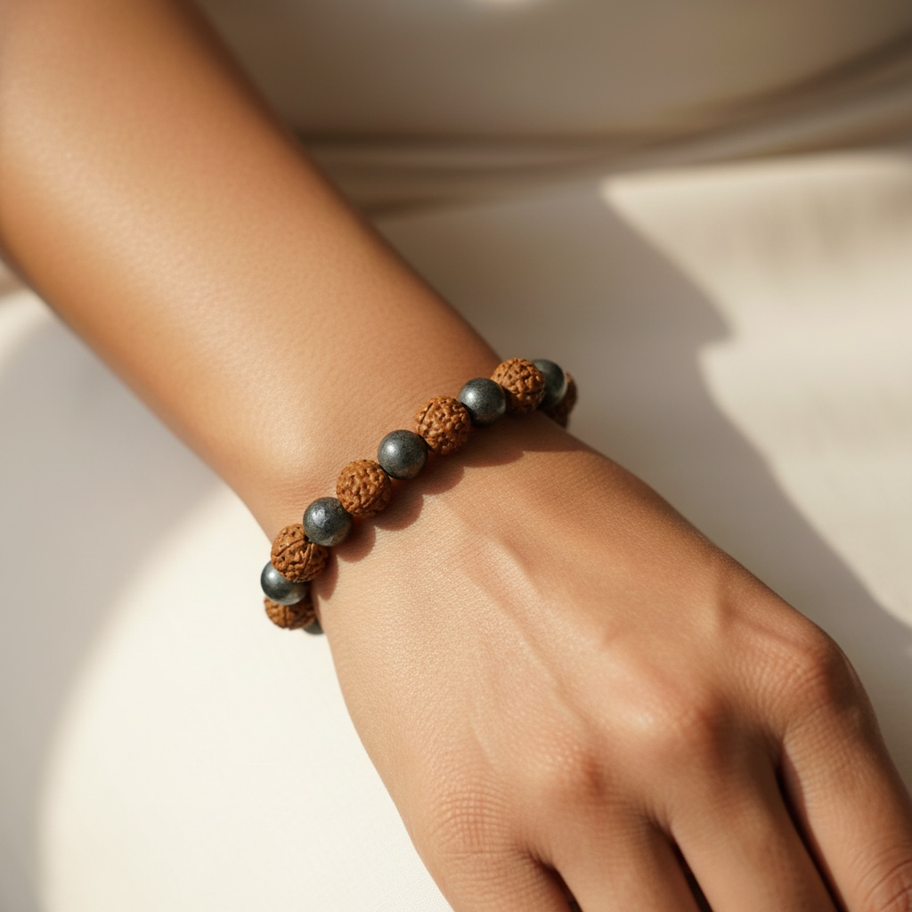 Crafted from authentic Pyrite and Rudraksha beads, this bracelet harmonizes material success with spiritual depth.