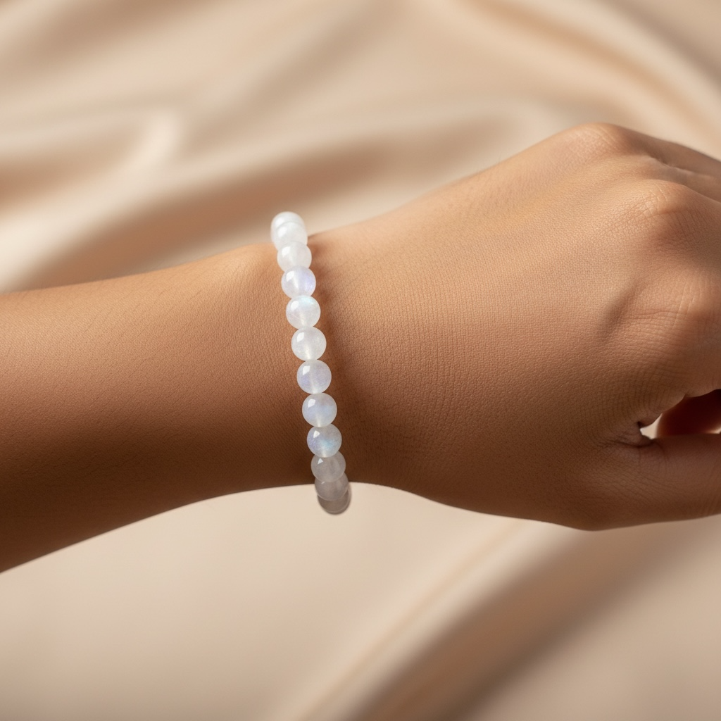 Handcrafted from genuine Rainbow Moonstone beads, this bracelet shimmers with soft iridescent flashes that mirror the magic of the moon. Known as the Stone of Divine Feminine, Moonstone aligns you with your intuition, emotional flow, and spiritual guidance. It gently clears the mind, stabilizes emotions, and inspires self-trust.